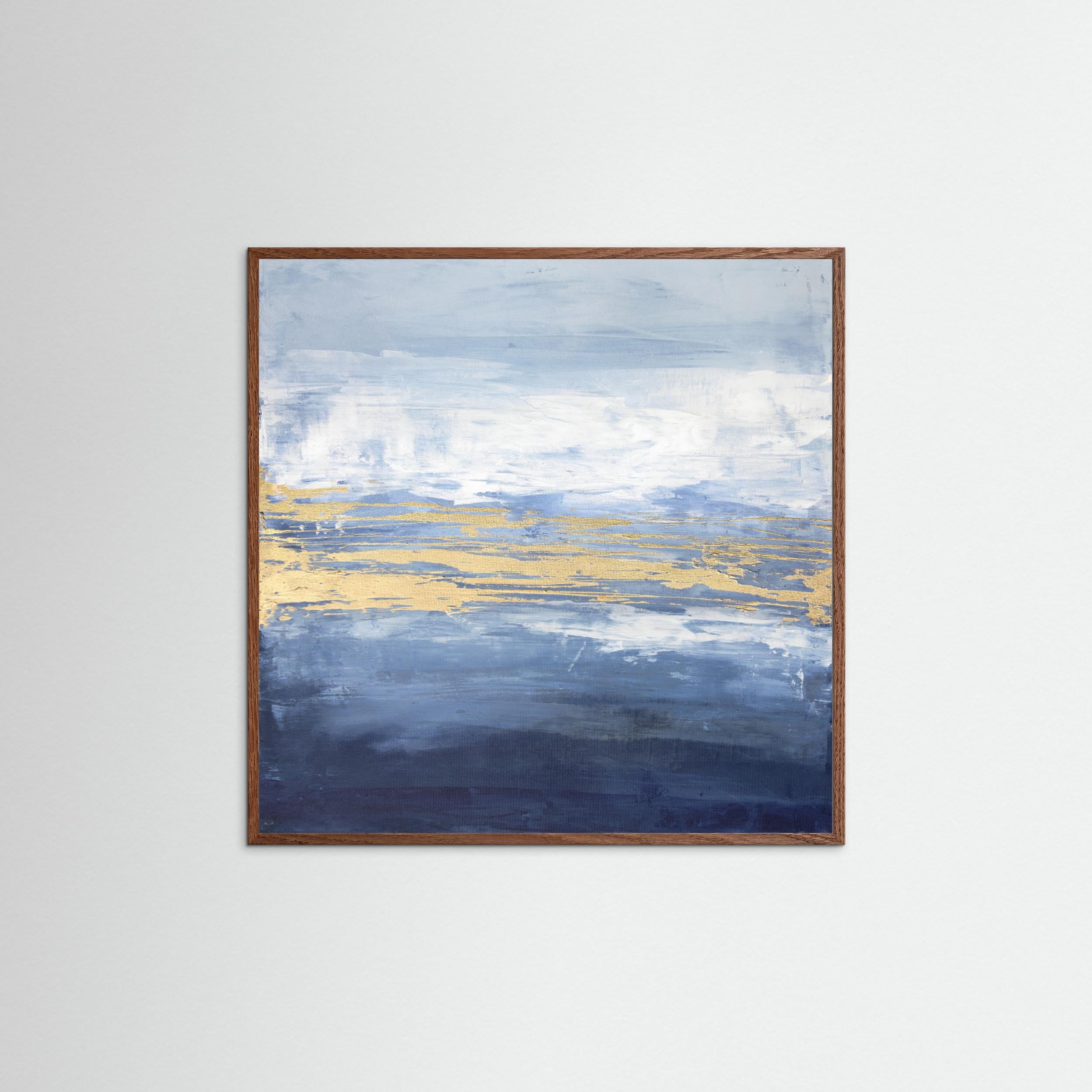 Set against a textured backdrop of sweeping horizontal brushstrokes, the vibrant gold leaf accents and the crisp, airy whites create a sophisticated colour palette that feels both classic and ethereal. The intentional inclusion of rich, metallic textures amidst the cool blue tones adds a touch of grounded luxury, making it the perfect addition to a modern living room, a tranquil home office, or a space designed for deep reflection.