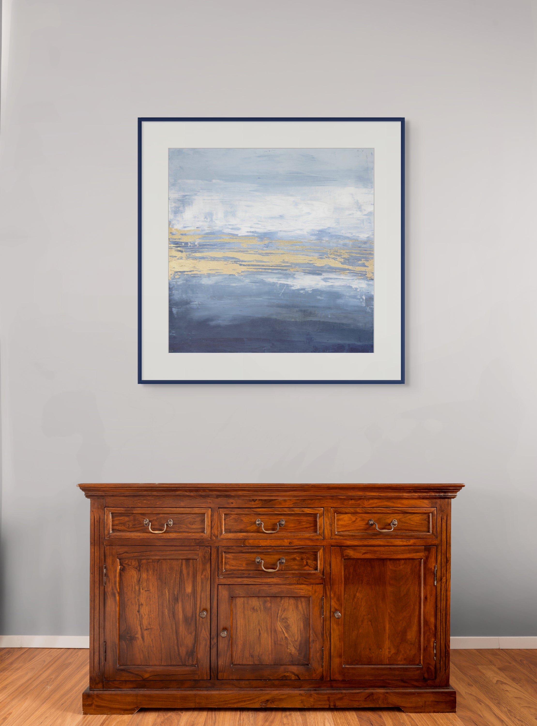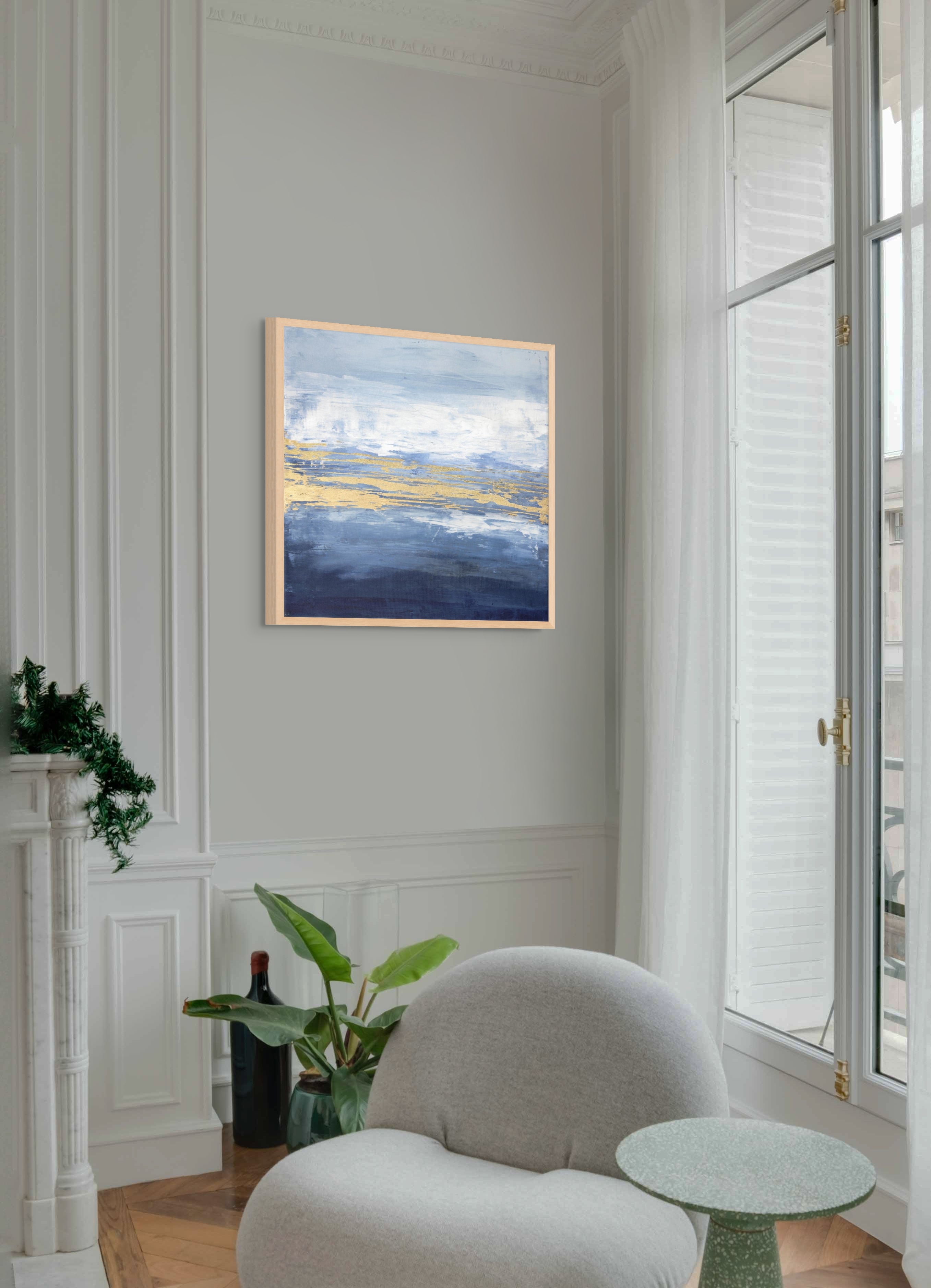"Gilded Tide" is more than just an abstract seascape; it is an invitation to slow down and savour the profound connection between the deep blue depths and the light of the horizon. Featuring a layered composition of cool indigos and misty whites, this piece captures the refreshing essence of a tide that carries both calm and brilliance.