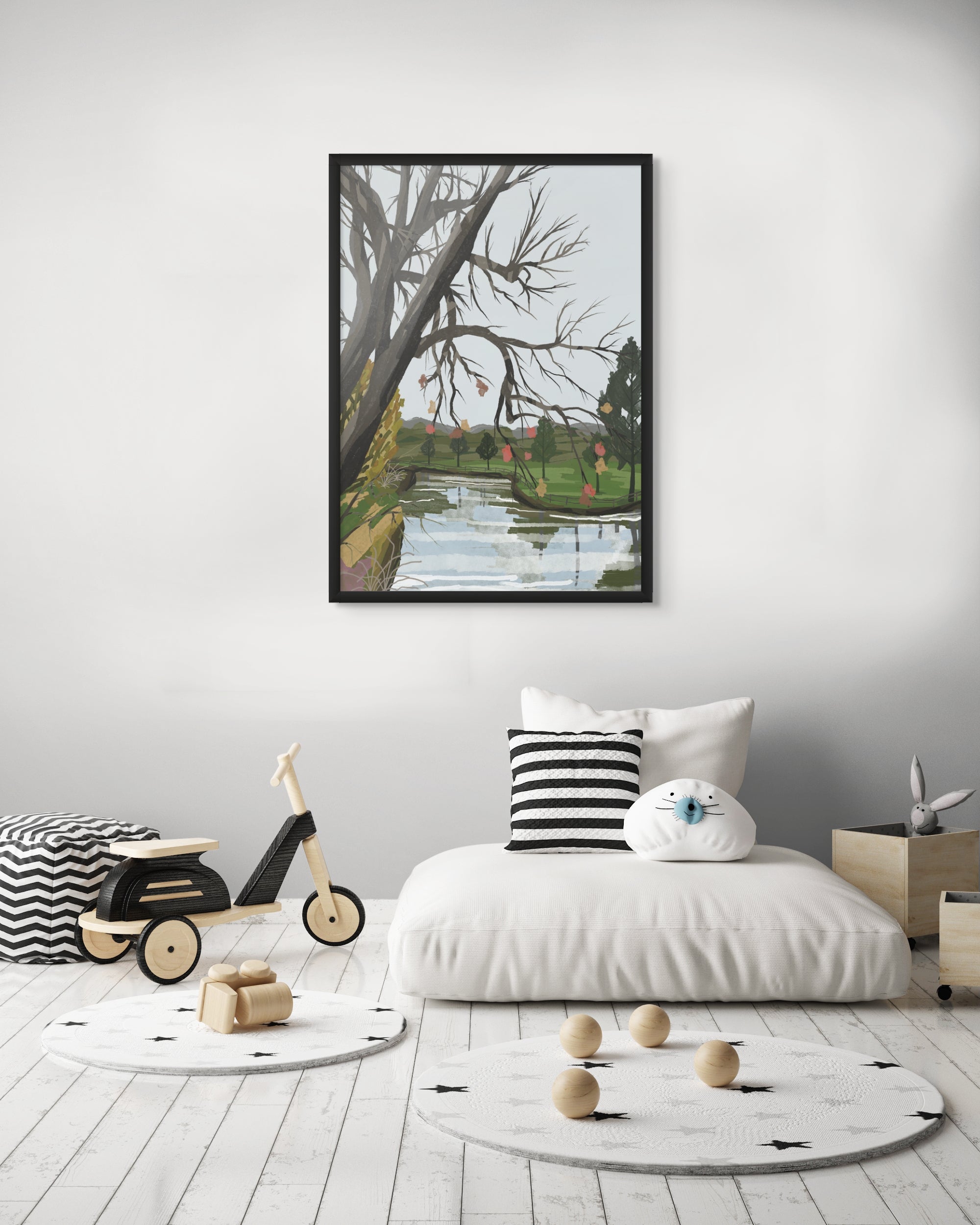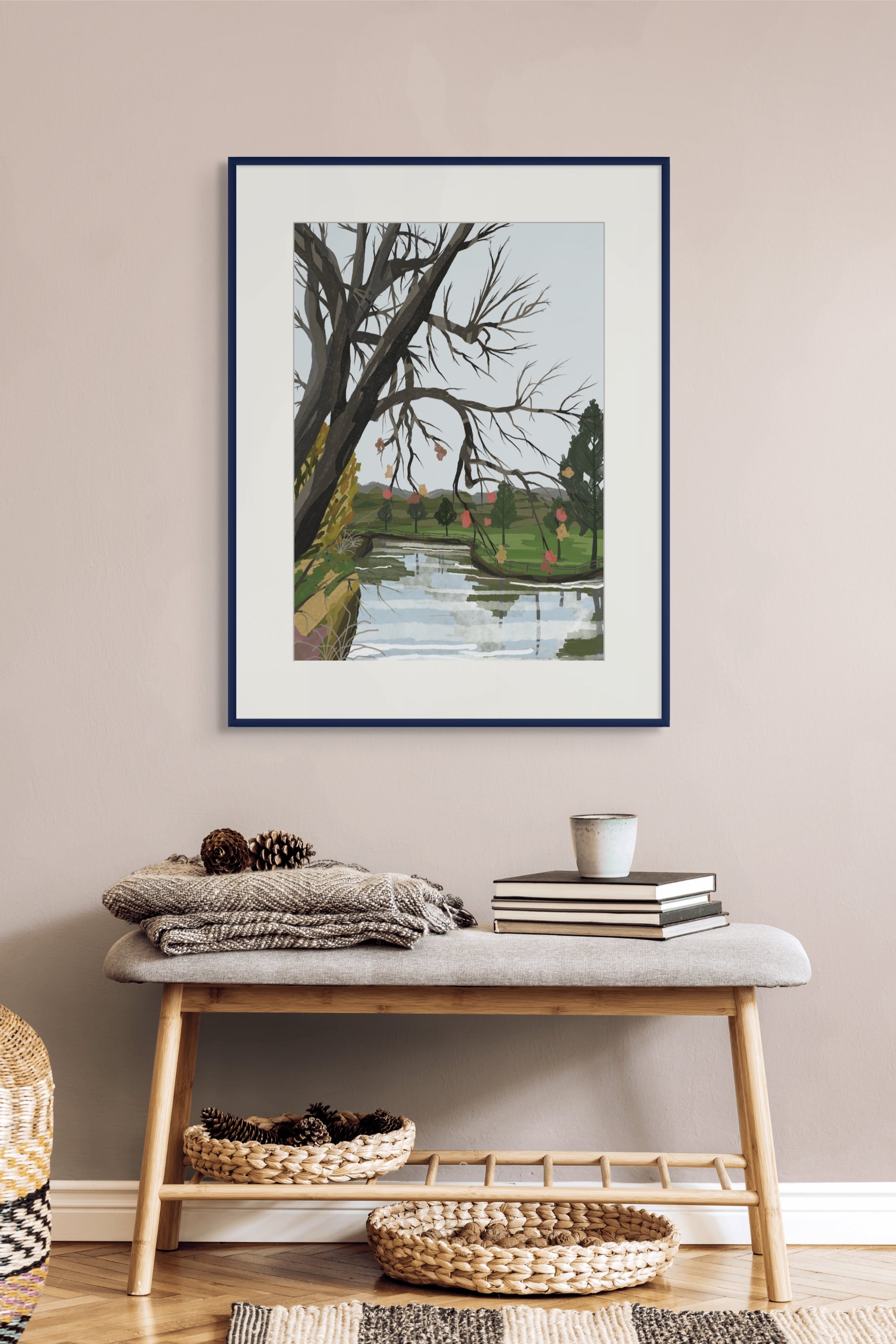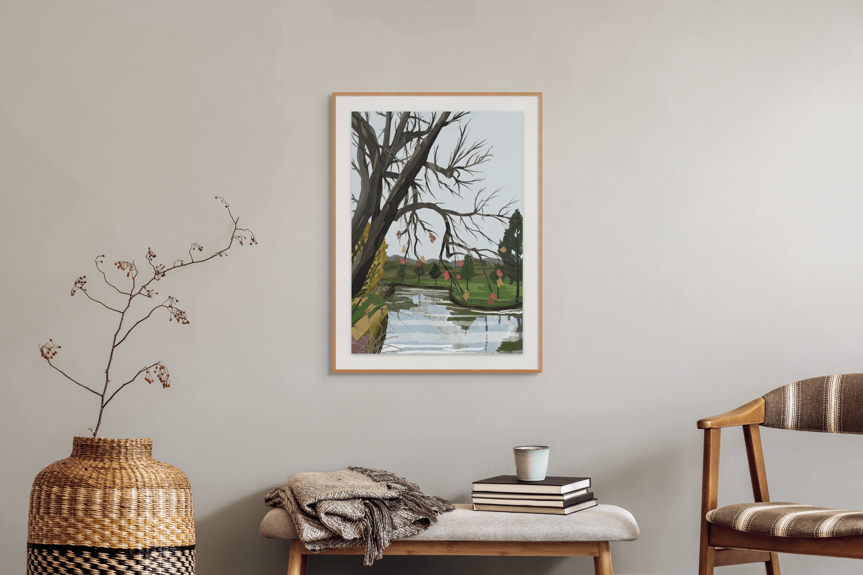 Transform your interior with River Canopy, a poignant and evocative addition to the Zeta Contemporary illustration collection. This piece captures a moment of quiet transition, where the intricate, skeletal beauty of winter branches meets the soft, rhythmic flow of a mirrored river. It is a sophisticated study in reflection and resilience, designed to bring a sense of calm, intellectual depth to your home gallery.