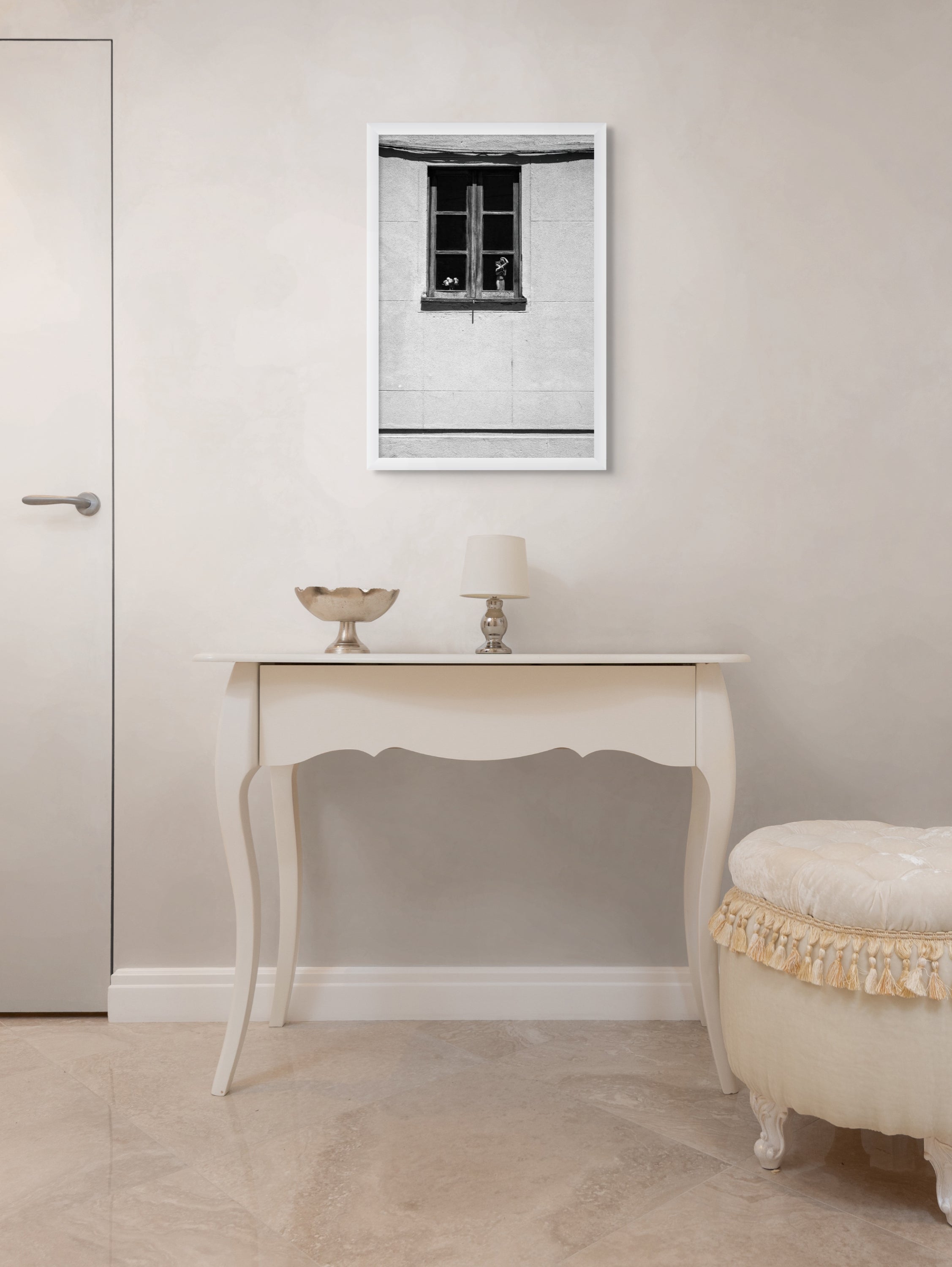 The Power of Texture: The black and white treatment beautifully highlights the gritty, tactile quality of the wall, contrasting sharply with the smooth glass and the dark, reflective wood of the window frame. This richness of texture makes the print compelling up close.